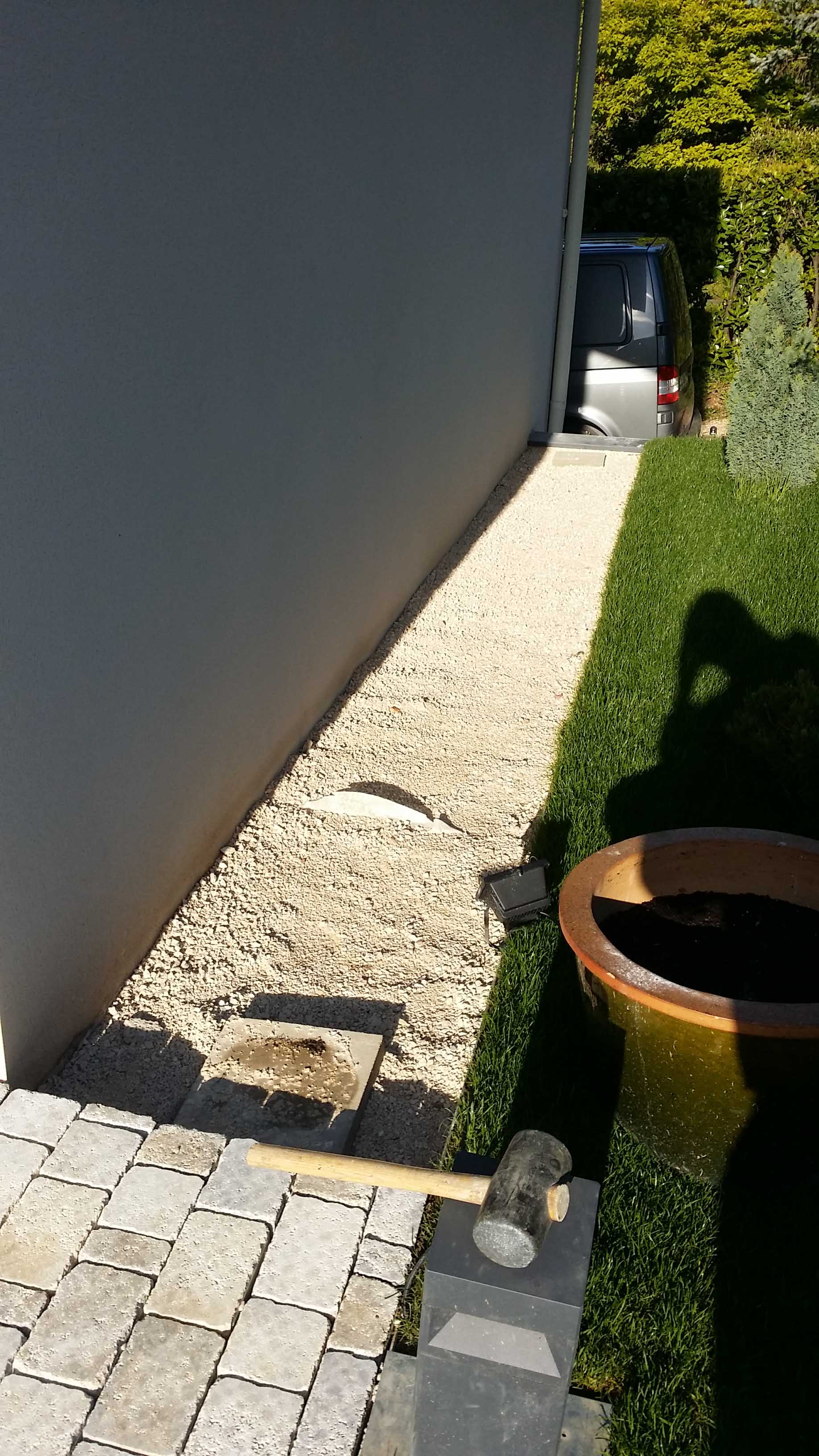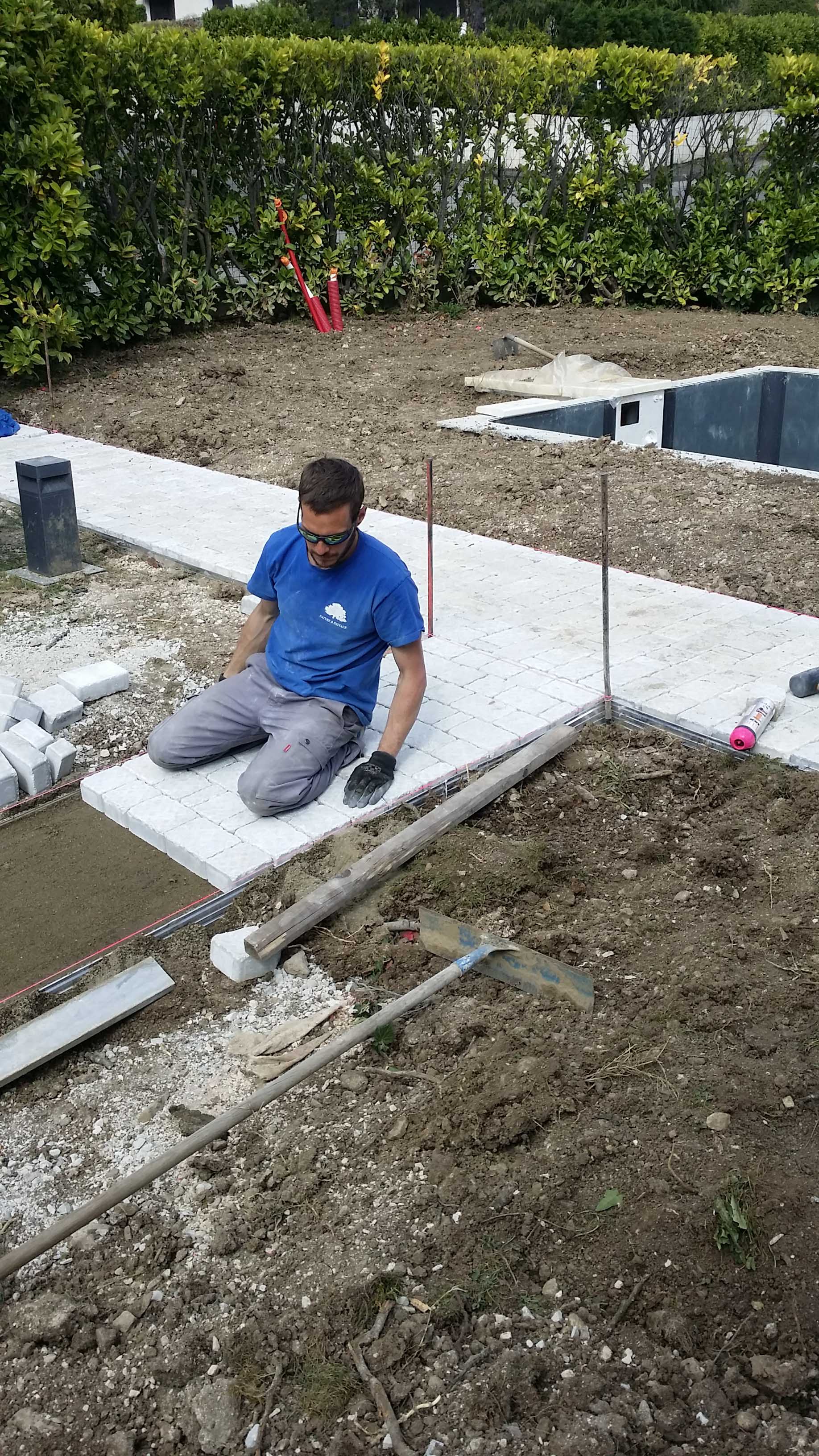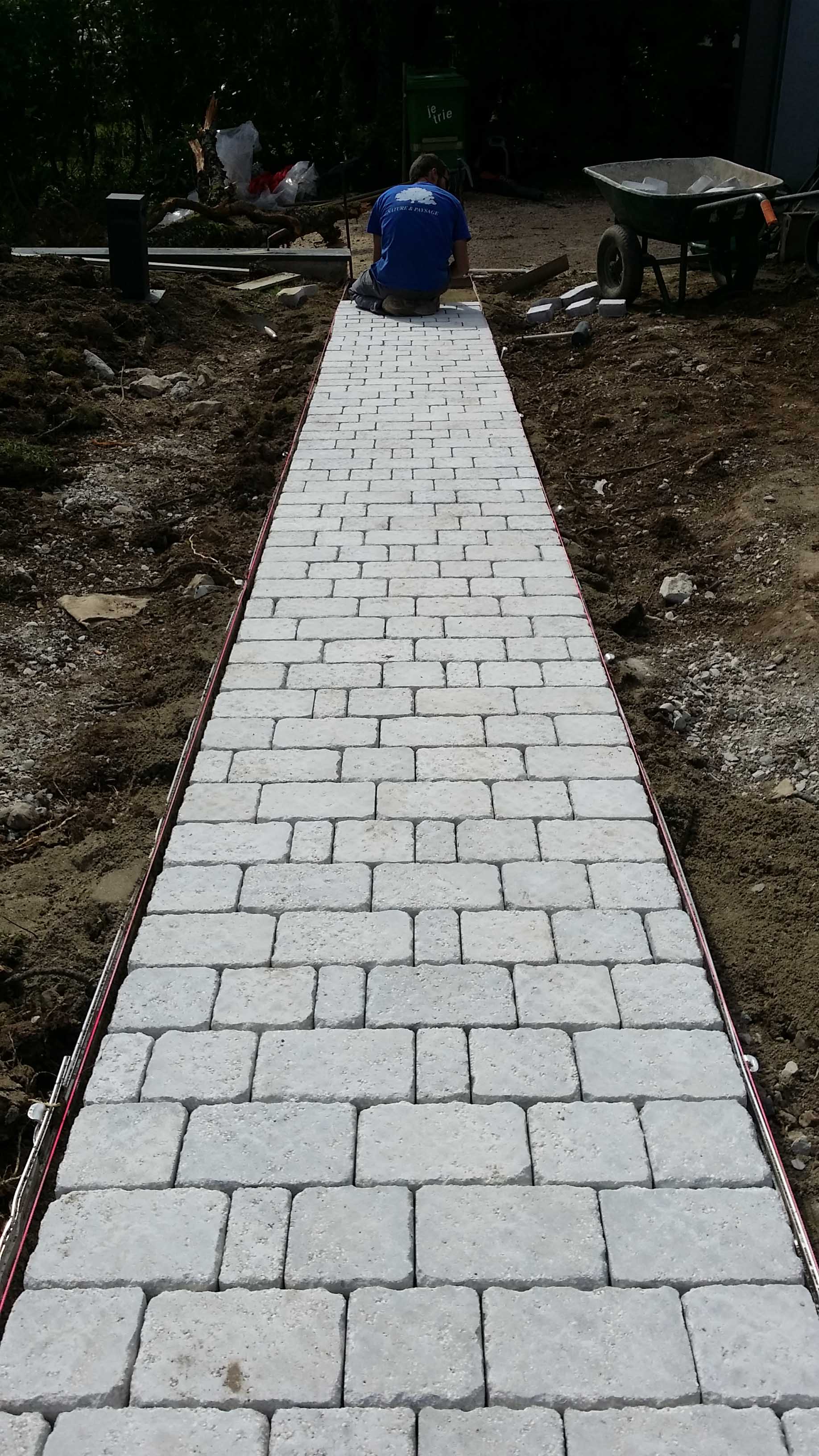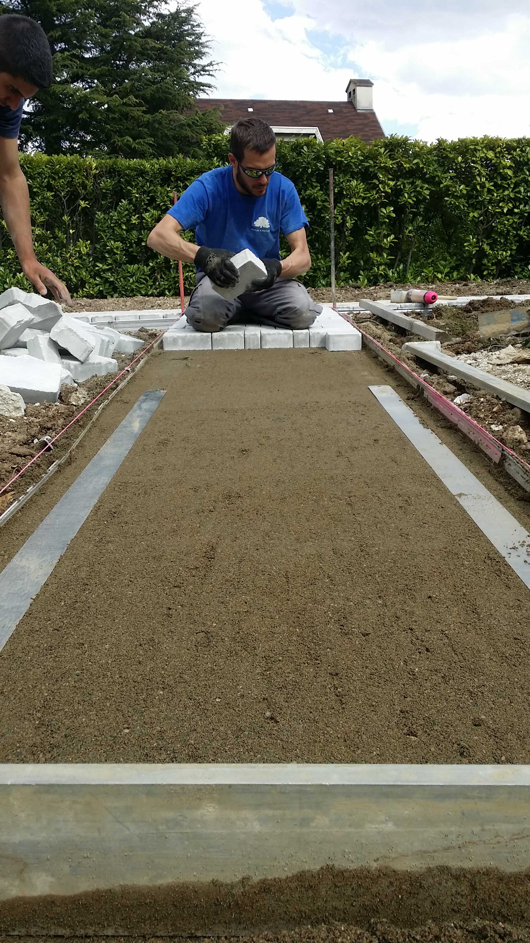 Pavage avec joints polymères et pose de gazon en plaques
